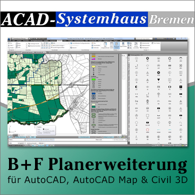 Diese Lösung - speziell für Stadtplaner - vereinfacht die Erstellung und Änderung von Bebauungsplänen und Flächennutzungsplänen erheblich. Sie bietet die komplette Symbolbibliothek PlanZV 90 auf zusätzlichen fertigen Registern sowie fertige Paletten mit allen Linientypen und deren Eigenschaften (thematisch gegliedert). Auch die Flächendarstellungen mit Füllungen und Schraffuren in AutoCAD Map ist noch komfortabler. Durch die intuitiv zu bedienende Oberfläche, ist ein schneller Einstieg für jeden Anwender möglich und das Tool ohne größere Einarbeitung zu verwenden.